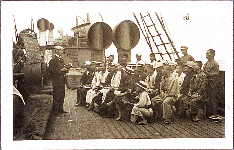 Japanese emmigrants learning Portuguese on their way to Brazil. 1908.