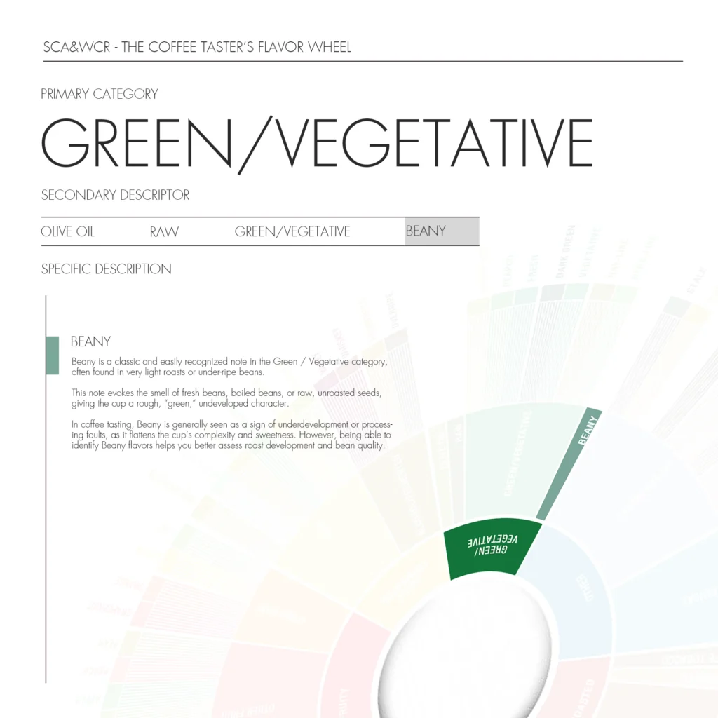 Beany is a classic and easily recognized note in the Green / Vegetative category, often found in very light roasts or under-ripe beans.