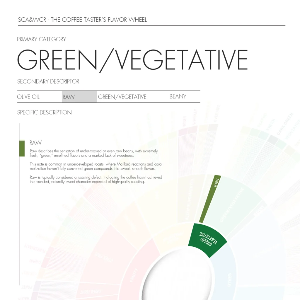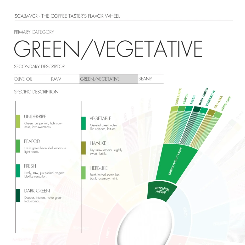 Green / Vegetative is a core category in the inner ring of the Specialty Coffee Association Flavor Wheel. It refers to herbaceous, raw, or plant-like notes in coffee.