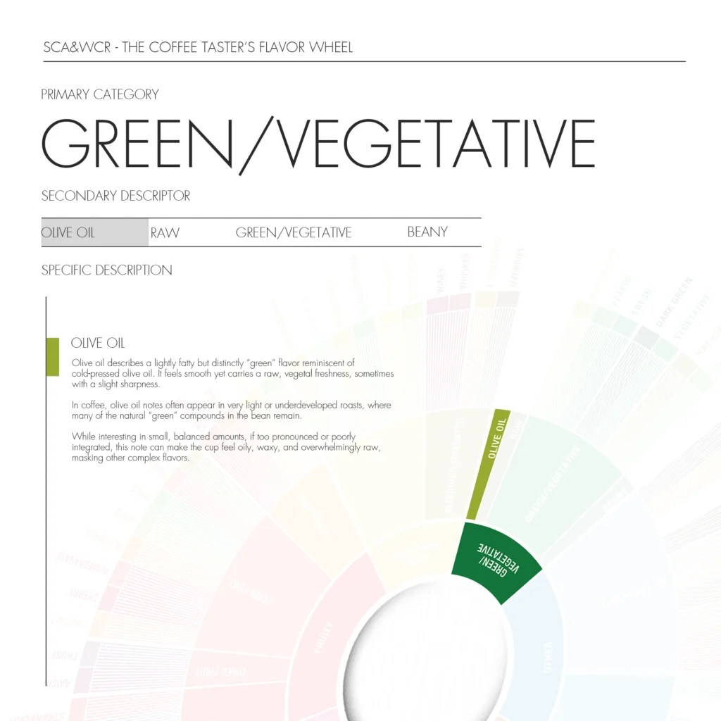 In coffee, olive oil notes often appear in very light or underdeveloped roasts, where many of the natural “green” compounds in the bean remain. While interesting in small, balanced amounts, if too pronounced or poorly integrated, this note can make the cup feel oily, waxy, and overwhelmingly raw, masking other complex flavors.