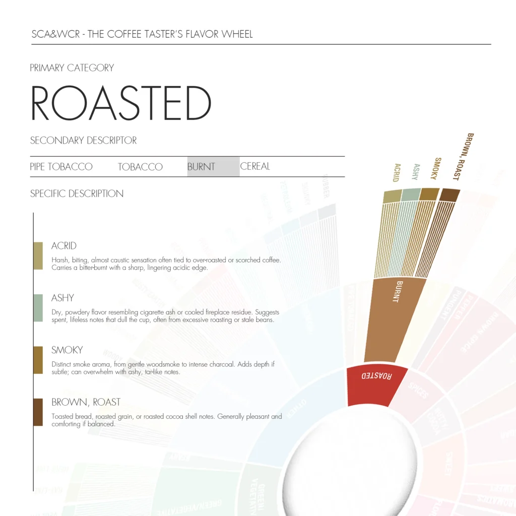 Burnt groups flavors typical of overly strong or localized charring during roasting. Depending on intensity, it can add body and strength or become a bitter, unpleasant defect. Detailed sensory notes include: