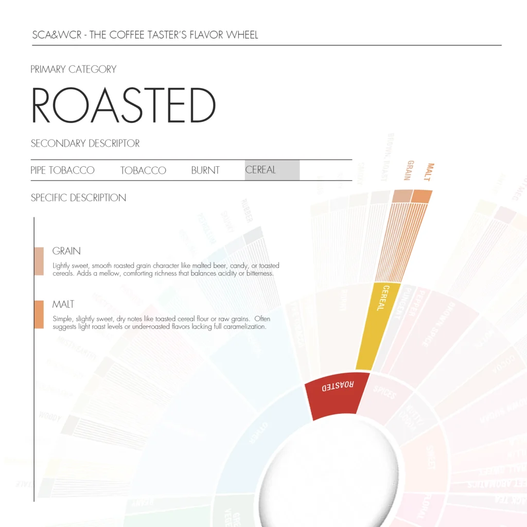 Cereal describes flavors reminiscent of roasted grain, malted barley, or cereal. Typically found in light to medium roasts, it adds warmth and comfort to the cup. Detailed sensory notes include: