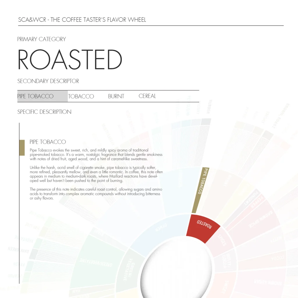 Unlike the harsh, acrid smell of cigarette smoke, pipe tobacco is typically softer, more refined, pleasantly mellow, and even a little romantic. In coffee, this note often appears in medium to medium-dark roasts, where Maillard reactions have developed well but haven’t been pushed to the point of burning.
