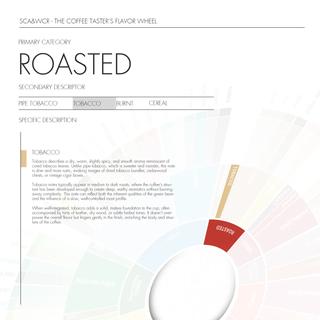 When well-integrated, tobacco adds a solid, mature foundation to the cup, often accompanied by hints of leather, dry wood, or subtle herbal tones. It doesn’t overpower the overall flavor but lingers gently in the finish, enriching the body and structure of the coffee.
